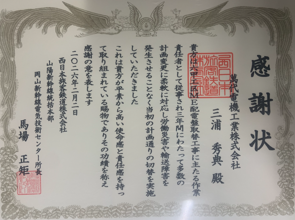 この度、当社は山陽新幹線 六甲工区ME配電盤取替工事において、主たる作業責任者として従事した三年間にわたる豊富な現場経験と高度な技術力を評価され、西日本旅客鉄道株式会社 山陽新幹線統括本部 岡山新幹線電気技術センター様より感謝状を頂戴いたしました。